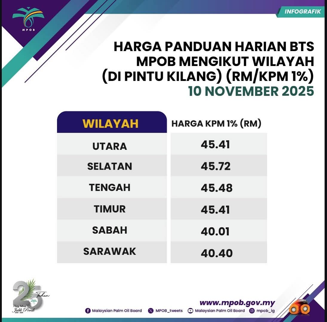 • 2 DISEMBER 2025: HARGA PANDUAN HARIAN BTS MPOB MENGIKUT WILAYAH (DI PINTU KILANG)