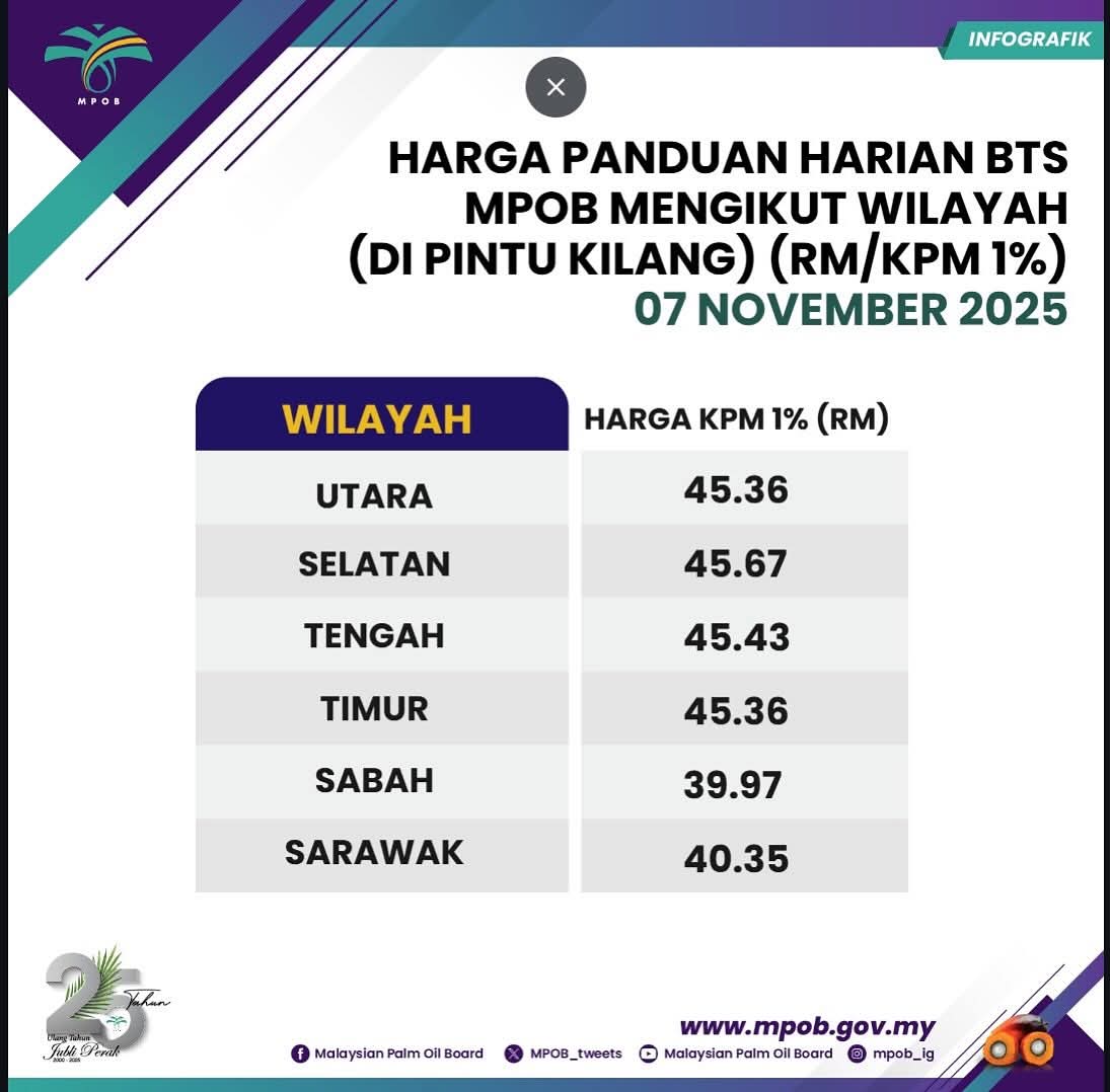 • HARGA PANDUAN TANDAN BUAH SEGAR (TBS) MPOB MENGIKUT WILAYAH: NOVEMBER 2025