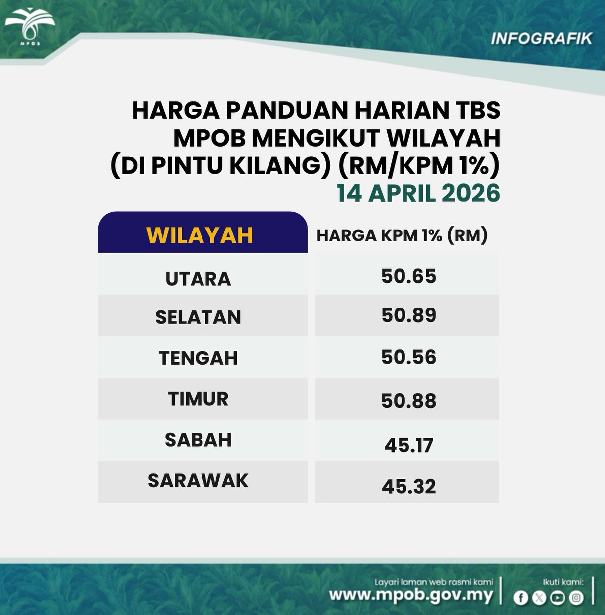 Daily FFB Price 14 April 2026: HARGA PANDUAN HARIAN TBS MPOB MENGIKUT WILAYAH (DI PINTU KILANG) By Asyraf Hüseyin / April 14, 2026 About The Author Asyraf Hüseyin See author's posts You may also like HARGA MINGGUAN MINYAK SAWIT: MINGGU- 1 APRIL 2026 By Asyraf Hüseyin / April 14, 2026 13 APRIL 2026: LAPORAN PASARAN HARIAN MINYAK SAWIT By Asyraf Hüseyin / April 14, 2026 10 APRIL 2026: LAPORAN PASARAN HARIAN MINYAK SAWIT By Asyraf Hüseyin / April 14, 2026 13 April 2026: HARGA PANDUAN HARIAN TBS MPOB MENGIKUT WILAYAH (DI PINTU KILANG) By Asyraf Hüseyin / April 14, 2026 Prestasi Industri Sawit bagi Mac 2026 berbanding Februari 2026. By Asyraf Hüseyin / April 14, 2026 Post navigation Previous 10 APRIL 2026: LAPORAN PASARAN HARIAN MINYAK SAWITNext EXPORTS OF PALM OIL TO MAJOR MARKETS