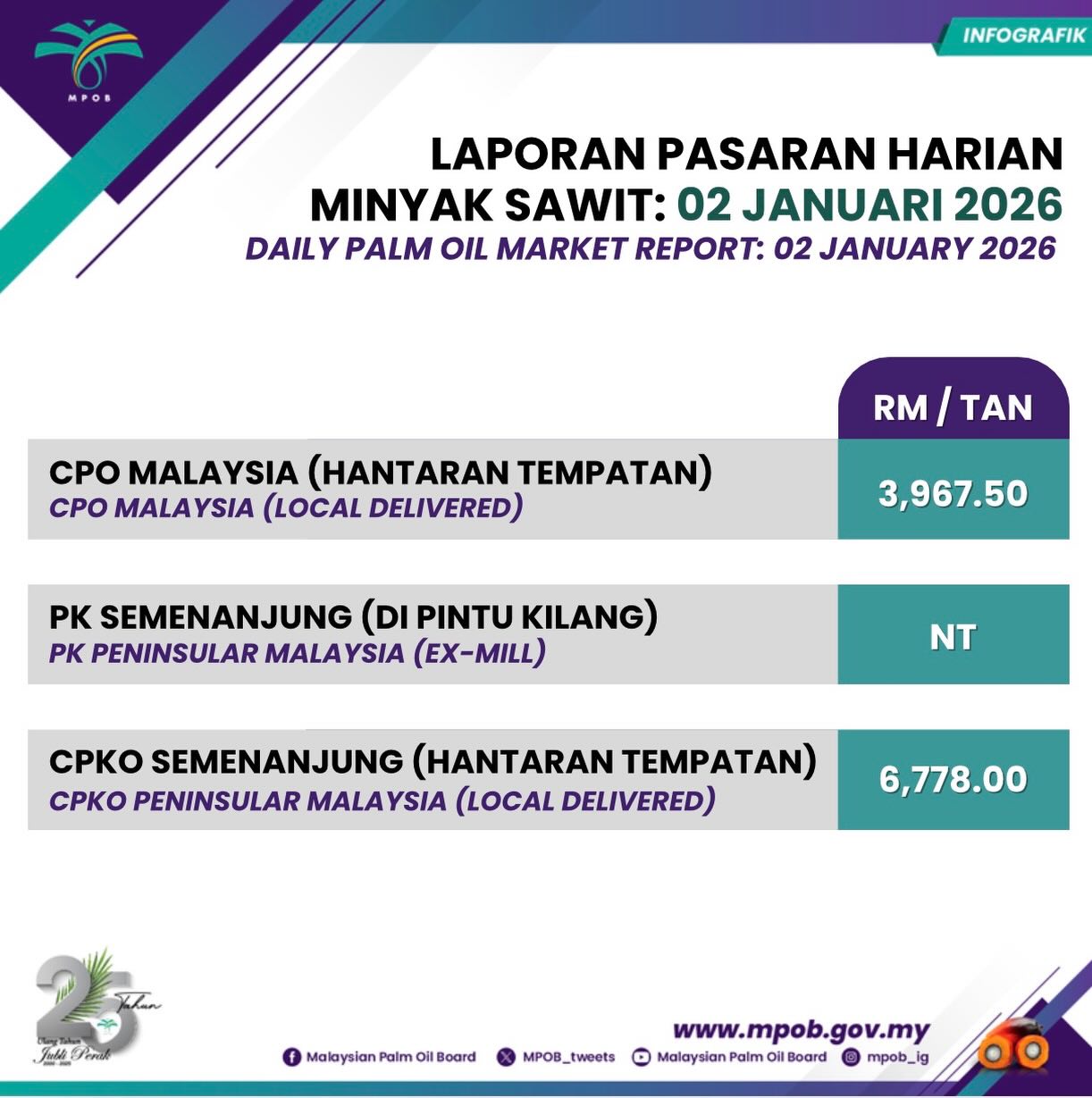 2 JANUARI 2026: HARGA PANDUAN HARIAN TBS MPOB MENGIKUT WILAYAH (DI PINTU KILANG)