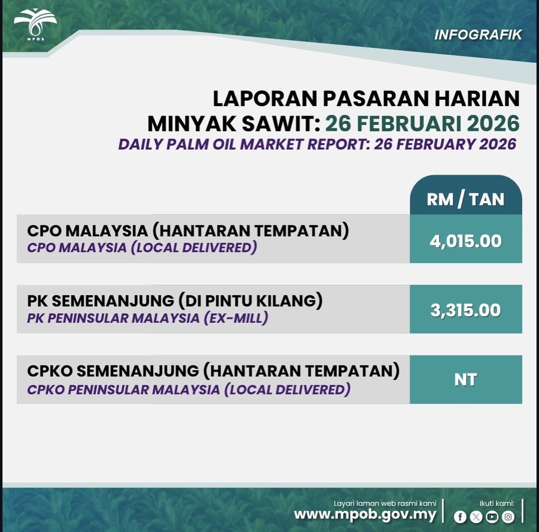 26 FEBRUARI 2026: LAPORAN PASARAN HARIAN MINYAK SAWIT