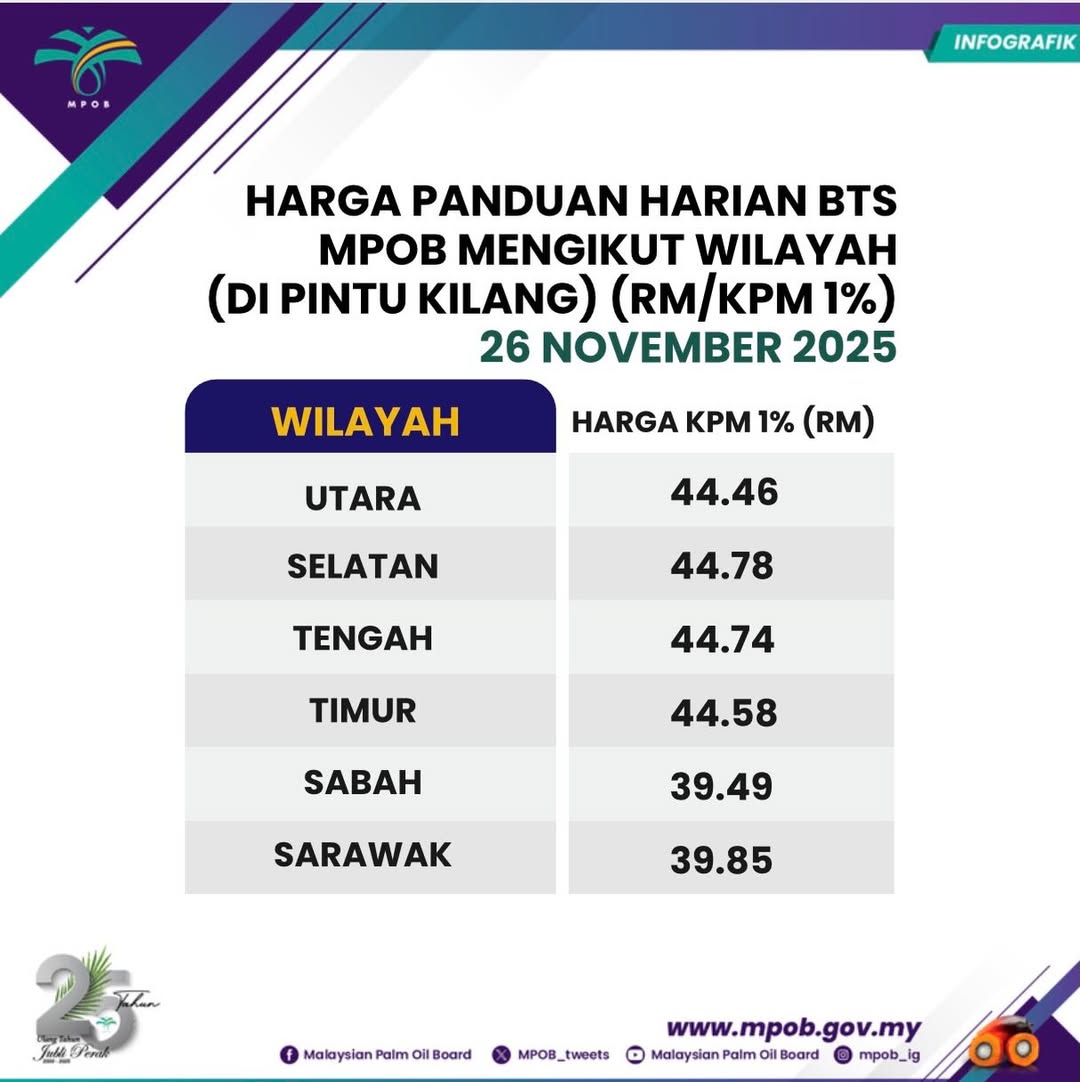 General Market Information Market Information Infographic Monthly Performance 26 NOVEMBER 2026: HARGA PANDUAN HARIAN BTS MPOB MENGIKUT WILAYAH (DI PINTU KILANG) By Asyraf Hüseyin / January 8, 2026 About The Author Asyraf Hüseyin See author's posts You may also like WILDLIFE CONSERVATION DAY By Asyraf Hüseyin / January 8, 2026 2 DISEMBER 2025: LAPORAN PASARAN HARIAN MINYAK SAWIT By Asyraf Hüseyin / January 8, 2026 HARGA PANDUAN TANDAN BUAH SEGAR (TBS) MPOB MENGIKUT WILAYAH: NOVEMBER 2025 By Asyraf Hüseyin / January 8, 2026 HARGA MINGGUAN MINYAK SAWIT MINGGU 4, NOVEMBER 2025 By Asyraf Hüseyin / January 8, 2026 1 DISEMBER 2025: LAPORAN PASARAN HARIAN MINYAK SAWIT By Asyraf Hüseyin / January 8, 2026 Post navigation Previous 25 NOVEMBER 2025: LAPORAN PASARAN HARIAN MINYAK SAWITNext 27 NOVEMBER 2026: HARGA PANDUAN HARIAN BTS MPOB MENGIKUT WILAYAH (DI PINTU KILANG)