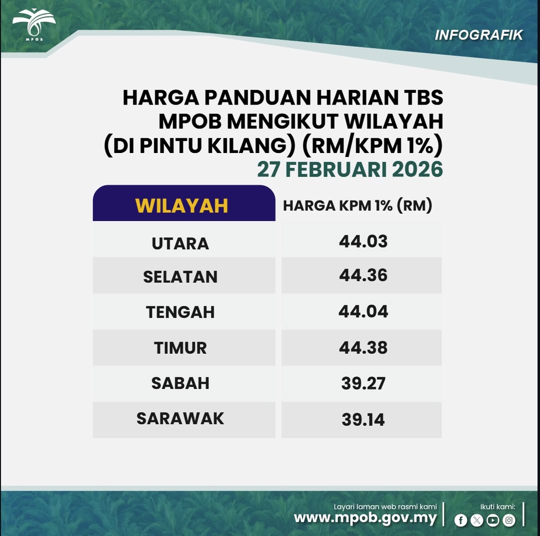 13 MAC 2026: HARGA PANDUAN HARIAN TBS MPOB MENGIKUT WILAYAH (DI PINTU KILANG)