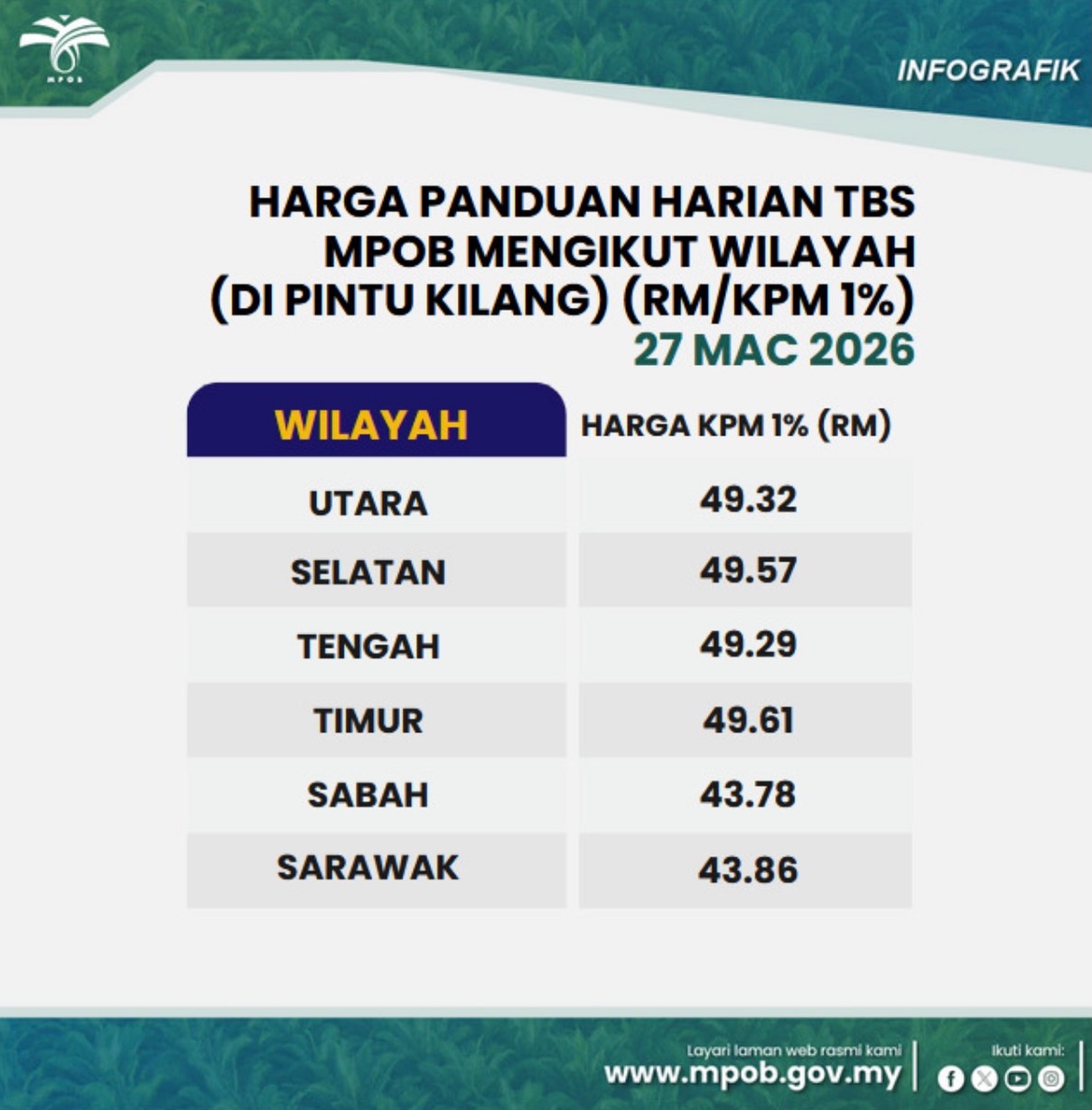 27 MAC 2026: HARGA PANDUAN HARIAN TBS MPOB MENGIKUT WILAYAH (DI PINTU KILANG)