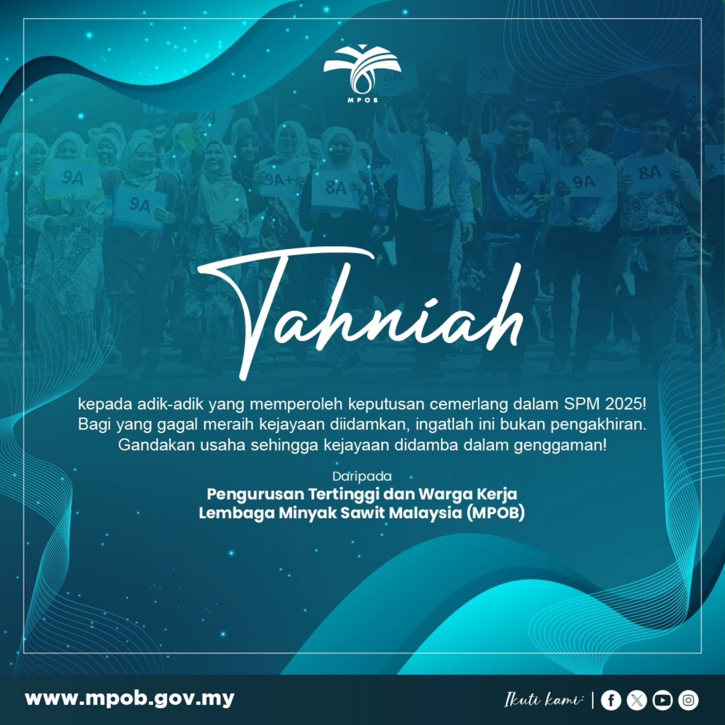 General General Greetings TAHNIAH SPM 2025 ! By Asyraf Hüseyin / April 6, 2026 About The Author Asyraf Hüseyin See author's posts You may also like Congrats, Dr. Norliyana, for winning Best Poster Presenter at SOILS 2026 last week! By Asyraf Hüseyin / April 14, 2026 BELASUNGKAWA ALLAHYARHAMAH ROHANI OTHMAN DQAN ALLAHYARHAM MOHD RADZUAN HUSSIN By Asyraf Hüseyin / April 14, 2026 Belasungkawa Allahyarham Hj Mohd Nasir Hassan Basri, Pesara PORIM. By Asyraf Hüseyin / April 14, 2026 HARI AUTISME SEDUNIA 2026 By Asyraf Hüseyin / April 6, 2026 SELAMAT ULANG TAHUN RTM KE-80 By Asyraf Hüseyin / April 6, 2026 Post navigation Previous PENGUMUMAN TOT 2026Next 31 MAC 2026: HARGA PANDUAN HARIAN TBS MPOB MENGIKUT WILAYAH (DI PINTU KILANG)